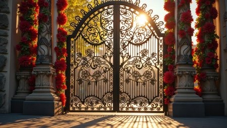Ornate iron gate surrounded by red flowers in sunlight. That the image is generated using AI.
