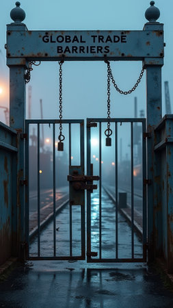 That the image is generated using AI. Rusty gate with lock at shipping yard on foggy day signifying global trade barriers.