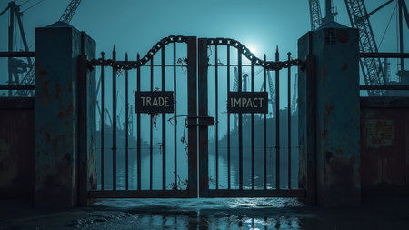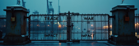 That the image is generated using AI. Industrial port gate at night with trade impact signs and crane silhouettes.