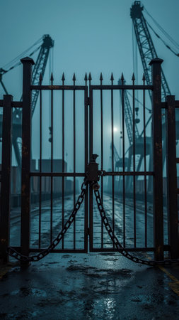 That the image is generated using AI. Locked gate at industrial port under foggy skyline with cranes.