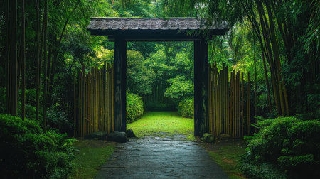 A picturesque entrance framed by bamboo and lush greenery, inviting visitors into a serene garden oasis filled with tranquility and natural beauty.
