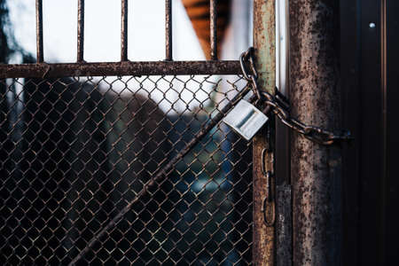 Gates with mesh on lock in iron fence. Metal gate with grid is fortified with diagonal reinforcement. Background image of steel rough gate with lock on chain.
