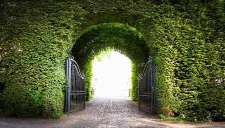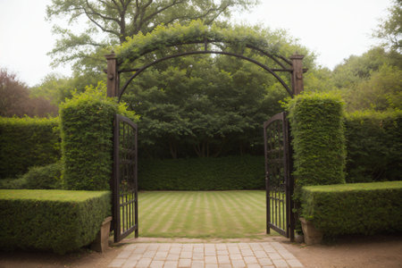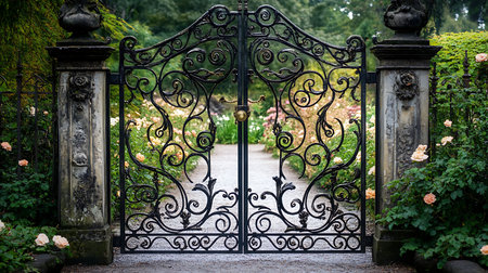 Ornate wrought iron gate stands slightly open, offering a glimpse into a vibrant, lush garden with green foliage and blooming flowers. symbolizes opportunity, entrance, and new beginnings.