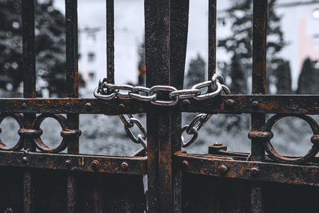 Wrought iron gate at sunset in the city. Selective focus.