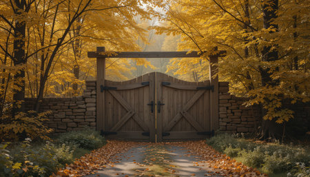 A wooden gate framed by colorful autumn leaves leads to a peaceful pathway in a forest setting.