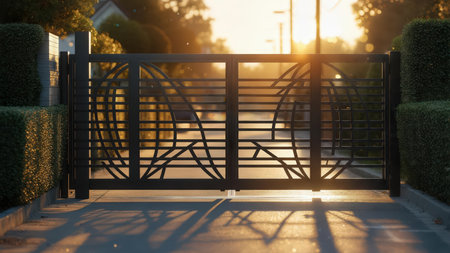 A beautifully designed gate stands open at sunset, revealing a peaceful street surrounded by greenery.