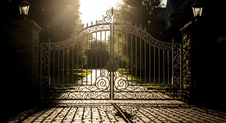 A grand, ornate iron gate stands closed at the entrance of a property, backlit by the bright morning sun. The intricate metalwork is flanked by stone pillars, casting long shadows on the paved driveway.
