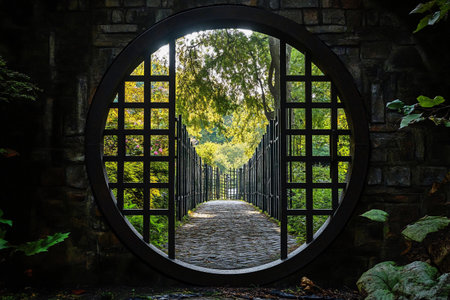 Through a beautifully aged round gate, a pathway reveals a sequence of similar black gates set against a backdrop of lush greenery