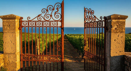 wrought iron gate in the garden at sunset, vintage style.