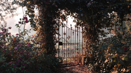A beautifully designed garden gate entwined with vibrant vines and flowers invites viewers to explore a peaceful landscape bathed in soft morning light.
