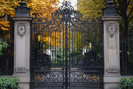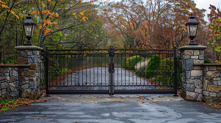 Ornate wrought iron gate standing closed at the entrance to a private estate with colorful fall foliage in the background