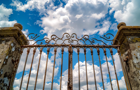 Low-angle view of a decorative iron gate, set against a bright blue sky with fluffy clouds