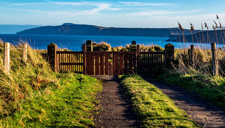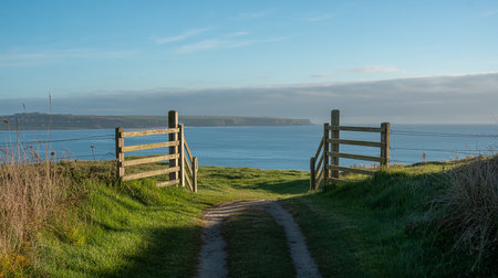 Path leading to the sea at low tide with wooden gate and grass
