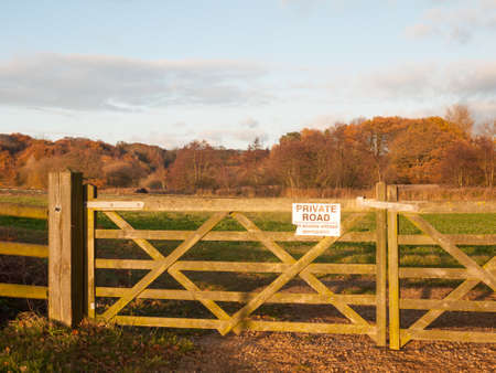 farmland countryside path trail track farm fence sign private road wood; essex; england; uk