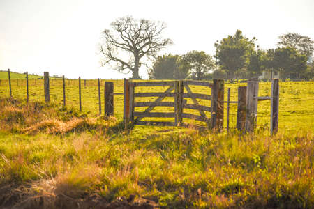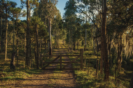 Trees covered by lichen and epiphytes with wooden farm gate on dirt pathway at sunset near Cambara do Sul. A small country town in southern Brazil with amazing natural tourist attractions.