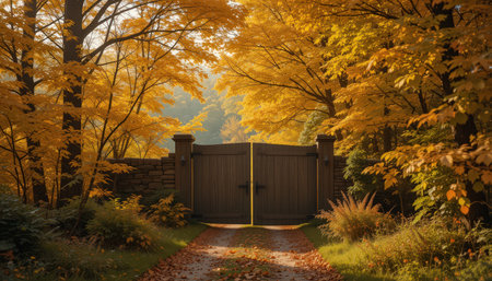 A wooden gate stands on a serene pathway enveloped by autumn foliage. The scene invites exploration, with vibrant leaves and soothing colors encapsulating nature's beauty.