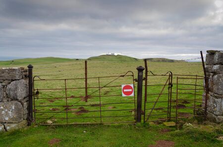 A rusty farm gate has a no entry symbol attached to it. Beside the gate is a rusty kissing gate. Both gates are topped with barbed wire. The location is on the Great Orme, Llandudno, North Wales, UK.