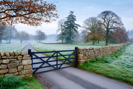 Countryside road passing a stone wall and wooden gate with frosted grass on a misty morning