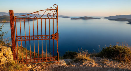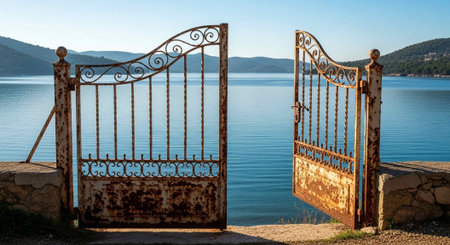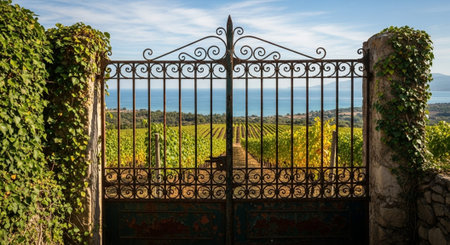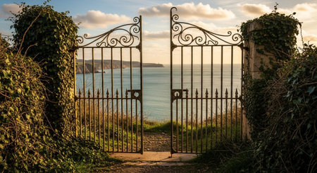ornate iron gate opening to a hidden path, created with generative ai