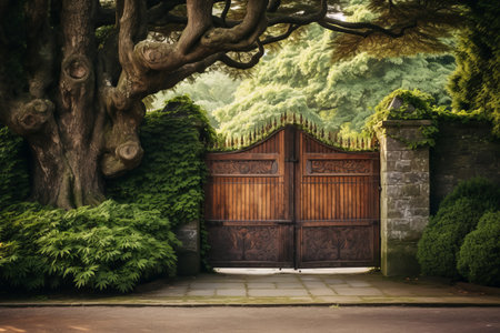 A Picturesque Combination of a Brown Wooden Gate and a Lush Green Leafed Tree -- AR 3:2