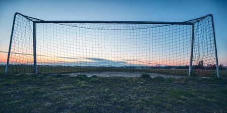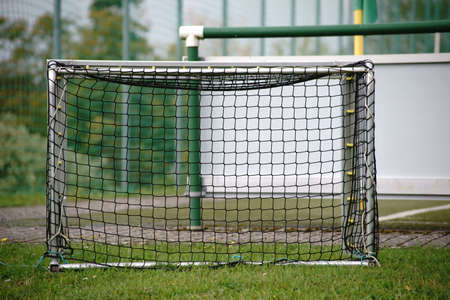 Soccer goalpost and net on practicing pitch as abstract sport and football background, selective focus