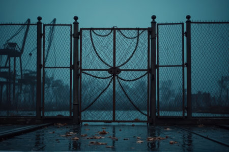 That the image is generated using AI. Misty industrial waterfront with chain-locked fence and overcast sky.