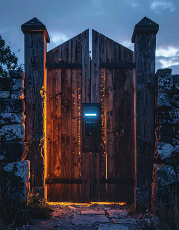At twilight, a warm glow emanates from behind an ancient wooden gate, hinting at a world within.