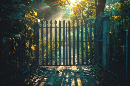 Sunbeams filter through a lush garden gate, casting enchanting shadows and creating a serene atmosphere. Nature beauty is captured in this tranquil scene. Generated A.I.