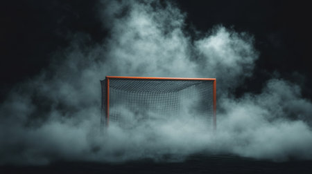 A football goal with a net emerging from dense fog, set against a dark backdrop with smoke swirling, evoking a tense sports moment.