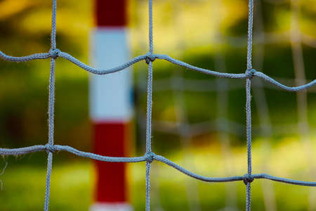 Football backgeound. Soccer football equipment. White soccer net on a goal. Soccer net nodes. Blurred goalpost in the background