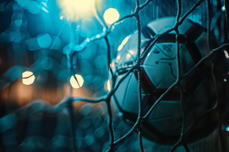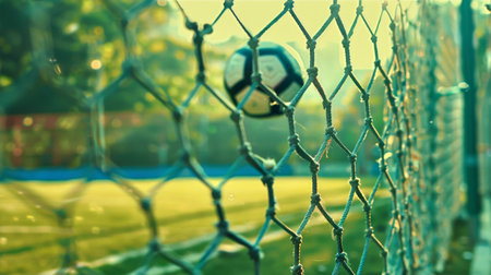 This close-up image captures the intricate detail of a football goal net, with a blurred stadium ambiance and warm lighting, conveying the energy of a match.