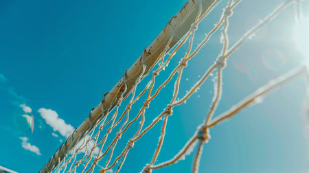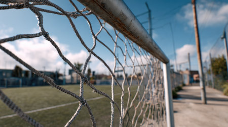 A close-up perspective of a soccer goal net showing intricate details against a blurred background featuring a sports field and vibrant sky.
