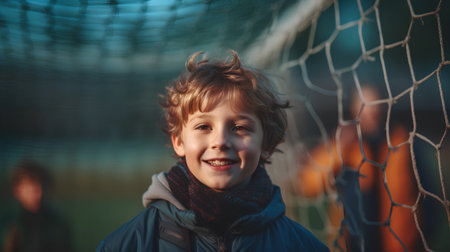 Portrait of a smiling boy in a blue jacket on the background of the football goal.