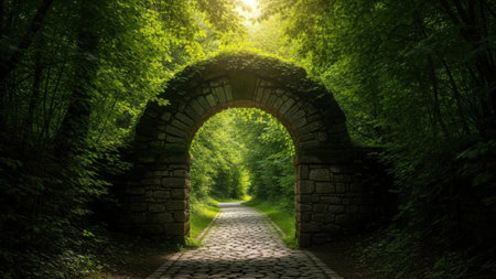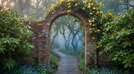 enchanting brick garden archway with yellow flowers framing a winding stone path through lush greenery on a misty morning.