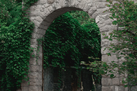 stone building landmark arch shape passage outdoor garden aged city street object with curly plants