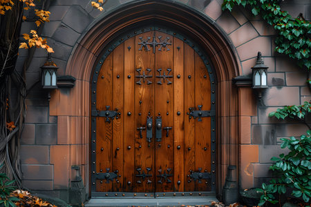 Rustic medieval wooden door with intricate iron hinges set in a stone archway, surrounded by ivy and autumn foliage. two vintage lanterns flank the doorway, enhancing the historic and fantasy ambiance. ideal for historical and fantasy concepts. Generative AI