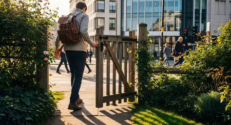 A man wearing a backpack opens a wooden gate to enter a garden area in a city setting. The image suggests a transition between urban life and a green space, or arriving at a destination.
