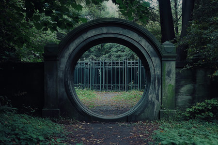 Through a beautifully aged round gate, a pathway reveals a sequence of similar black gates set against a backdrop of lush greenery