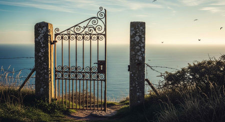 An ornate wrought iron gate with intricate details glows warmly in golden sunlight, surrounded by lush trees and serene pathway