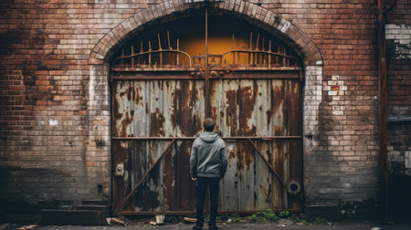 That the image is generated using AI. Rusty gate with stock market decline text in foggy industrial setting.