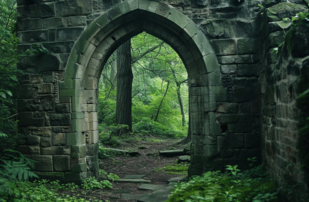 Captured on an overcast day, a weathered stone archway, adorned with moss, provides a view to a vibrant green field. Tall grasses frame the path leading through the arch, creating a serene yet mysterious ambiance.