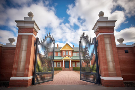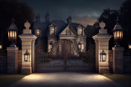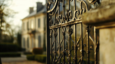 iron gates, with intricate scrollwork and filigree, leading to stately mansion, created with generative ai