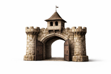 Studio photo medieval town gate stone wall segment with small watchtower and open wooden doors revealing empty passage isolated on white background