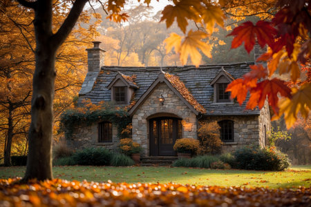 Charming English Cottage Surrounded by Autumn Foliage.
