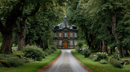 A stunning historic mansion stands majestically amidst a foggy forest at dawn, featuring a serene gravel pathway leading to its elegant entrance.