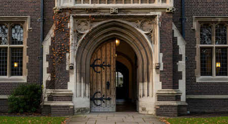 An old, heavy wooden door with black iron hinges stands slightly ajar within a grand, gothic-style stone archway of a historic brick building. The scene evokes a sense of history, academia, mystery, and opportunity.