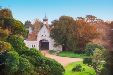 Panoramic landscape with clock tower gate leading to garden in forested park with green grass lawns, trees and paved paths. Medieval exterior design. Selective focus, copy space