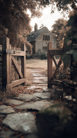 A wooden gate opens to a quiet pathway surrounded by stone walls and lush greenery, leading to a cozy cottage. The warm light of sunset enhances the peaceful atmosphere.