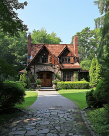 A stone path winds through the forest, leading to a charming house nestled among the trees.