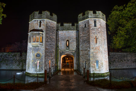 Bishop's Palace Gatehouse in Wells, Somerset, UK illuminated at Night with the drawbridge out